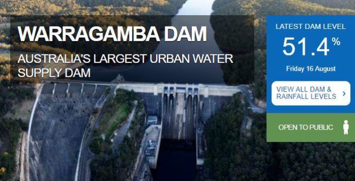Το Φράγμα Ουαραγκάμπα, που είναι η κύρια πηγή υδροδότησης της πόλης, βρίσκεται στο 51,4% της χωρητικότητάς του, ποσοστό που φανερώνει μείωση κατά 17,8% μέσα σ’ ένα χρόνο, ενώ η στάθμη του νερού είναι λίγο πάνω από το μισό της στάθμης που είχε πριν από δύο χρόνια. Η ποσότητα του νερού που ρέει στο φράγμα είναι μόλις το 10% αυτής που ήταν πριν από έναν χρόνο, σύμφωνα με τη ρυθμιστική αρχή της Νέας Νότιας Ουαλίας WaterNSW.
