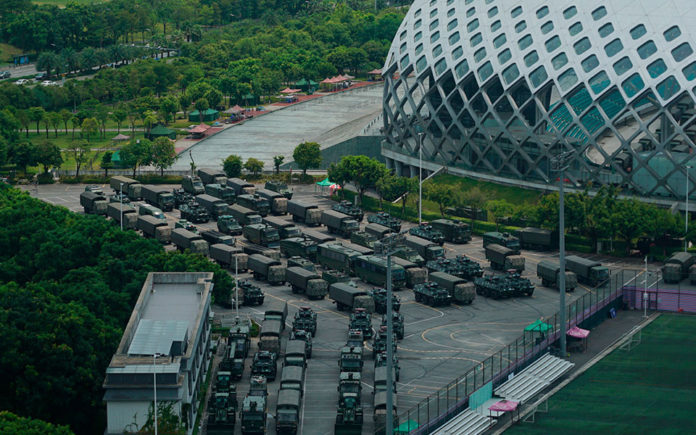 Λίγα μόλις χιλιόμετρα από το ασιατικό χρηματοοικονομικό κέντρο, οι αθλητικές εγκαταστάσεις του Σενζέν είναι πλέον γεμάτες από χιλιάδες άνδρες της Ένοπλης Κινεζικής Αστυνομίας (PAP), μίας ειδικής μονάδας που έχει αρμοδιότητα τη συντριβή εσωτερικών αναταραχών και βίαιων διαδηλώσεων.