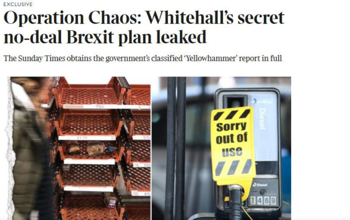 Η Βρετανία θα βρεθεί αντιμέτωπη με ελλείψεις καυσίμων, τροφίμων και φαρμάκων εάν αποχωρήσει από την Ευρωπαϊκή Ένωση χωρίς συμφωνία, ενώ θα προκληθεί κομφούζιο στα λιμάνια και θα απαιτηθούν σκληρά σύνορα με την Ιρλανδία, αναφέρουν κυβερνητικά έγγραφα που διέρρευσαν και δημοσιεύονται στο σημερινό φύλλο της εφημερίδας The Sunday Τimes, σε δημοσίευμα που φέρει τοιν τίτλο «Επιχείρηση χάος».