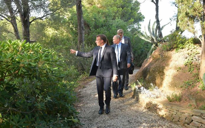 Ο Μακρόν κάλεσε τον Πούτιν στην προεδρική εξοχική κατοικία στο Φορτ ντε Μπρεγκανσόν της Γαλλικής Ριβιέρας, για ιδιωτική συνάντηση, η οποία περιλάμβανε και δείπνο. Οι συνομιλίες πραγματοποιήθηκαν μόλις λίγες ημέρες πριν ξεκινήσει η σύνοδος κορυφής της ομάδας των 7 (G7) στην πόλη Μπιαρίτζ, όπου θα παρευρεθούν, μεταξύ άλλων, ο πρόεδρος των ΗΠΑ Ντόναλντ Τραμπ και η Γερμανίδα καγκελάριος Αγκελα Μέρκελ. Η Γαλλία κατέχει τη φετινή προεδρία του G7, όπου περιλαμβάνονται ακόμη η Βρετανία, ο Καναδάς, η Γερμανία, η Ιταλία και η Ιαπωνία. Η Ρωσία, πρώην μέλος των συνόδων κορυφής που τότε αποκαλούνταν G8, αποκλείστηκε από την ομάδα μετά την προσάρτηση της περιοχής της Κριμαίας, το 2014.