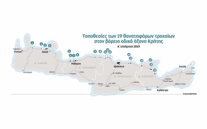 Στο Ηράκλειο, στα Χανιά και στον βόρειο οδικό άξονα εντοπίζονται τα περισσότερα θανατηφόρα τροχαία στην Κρήτη. Φέτος, το α΄ εξάμηνο του έτους, 7 άτομα έχασαν τη ζωή τους στους δρόμους του Ηρακλείου, 7 στο οδικό δίκτυο των Χανιών και 5 στον βόρειο οδικό άξονα Κρήτης (ΒΟΑΚ). Σοκάρει η διαπίστωση ότι μόνο το διάστημα από αρχές Ιουλίου και μέχρι τον Δεκαπενταύγουστο σκοτώθηκαν σε τροχαία 13 άτομα! Ως αιτίες επισημάνθηκαν η χρήση αλκοόλ, η μη χρήση ζώνης-κράνους, η υπερβολική ταχύτητα, η παραβίαση των κανόνων οδικής κυκλοφορίας. Σε όλη τη διάρκεια του 2018 αντίστοιχα, στην Κρήτη καταγράφηκαν 48 θάνατοι από τροχαία. Οι 22 από αυτούς στον νομό Ηρακλείου, 11 στον νομό Χανίων, 5 στο Ρέθυμνο, 3 στο Λασίθι και 7 στον ΒΟΑΚ.