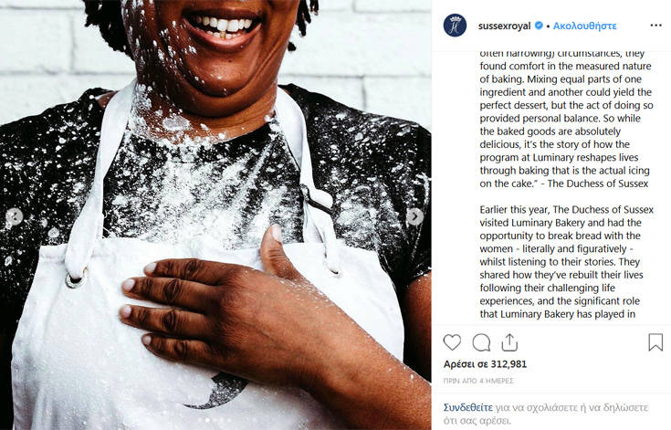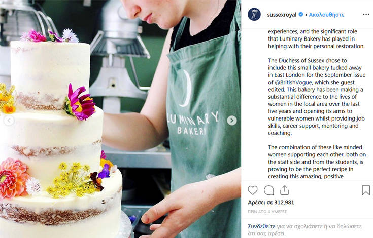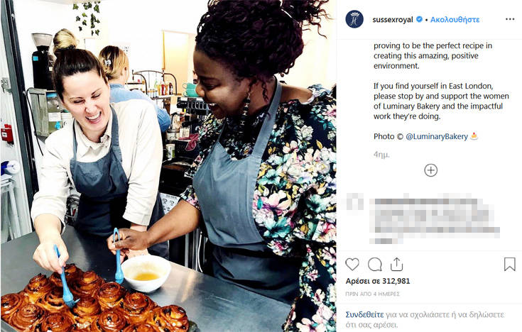 Η Μέγκαν Μαρκλ εξήρε ένα αρτοποιείο στο Ανατολικό Λονδίνο για το έργο που επιτελεί για τις γυναίκες. Η δούκισσα του Σάσσεξ έχει δημοσιεύσει στο λογαριασμό της στο Instagram τον θαυμασμό της για την κοινωνική επιχείρηση που βοηθάει τις γυναίκες και το οποίο περιγράφεται ως: