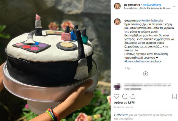 «Εγώ πάντως ξέρω τι θα γίνει η κόρη μου όταν μεγαλώσει….από τα χεράκια της φέτος η τούρτα μου!!! Εκείνη βέβαια μου λέει ότι θα γίνει γιατρός….κ ότι φυσικά κ χρειάζεται να δουλεύεις με τα χεράκια σου κ ζαχαρόπαστα …κ μακιγιάζ …. κ τα πάντα… Πάντως σίγουρα είναι πολύ καλή προσπάθεια!!! Love you» έγραψε χαρακτηριστικά.