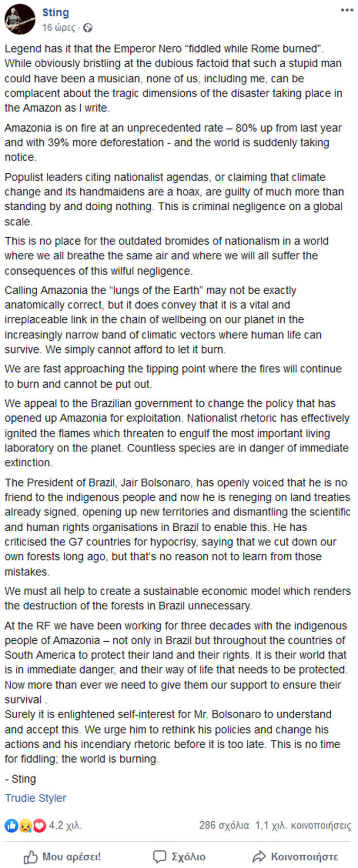 Τον τρόπο με τον οποίο διαχειρίζεται τις καταστροφικές πυρκαγιές στο δάσος του Αμαζονίου η κυβέρνηση της Βραζιλίας καταδικάζει με ποστ του στο Facebook ο Στινγκ.