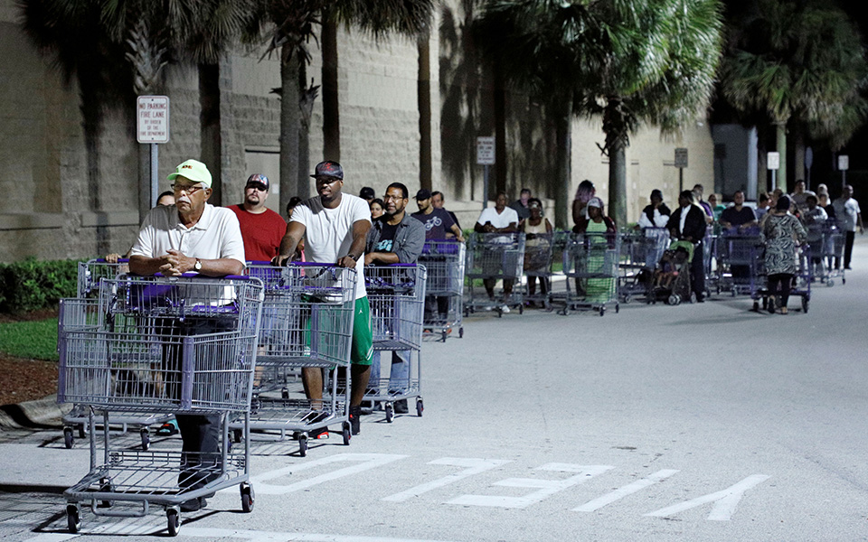 Οι κάτοικοι των περιοχών που αναμένεται να χτυπήσει ο τυφώνας θωρακίζουν από το πρωί τα σπίτια τους και κάνουν ουρές στα σούπερ μάρκετ για να προμηθευτούν είδη πρώτης ανάγκης, με αποτέλεσμα τα ράφια να έχουν αδειάσει σε πολλά καταστήματα.