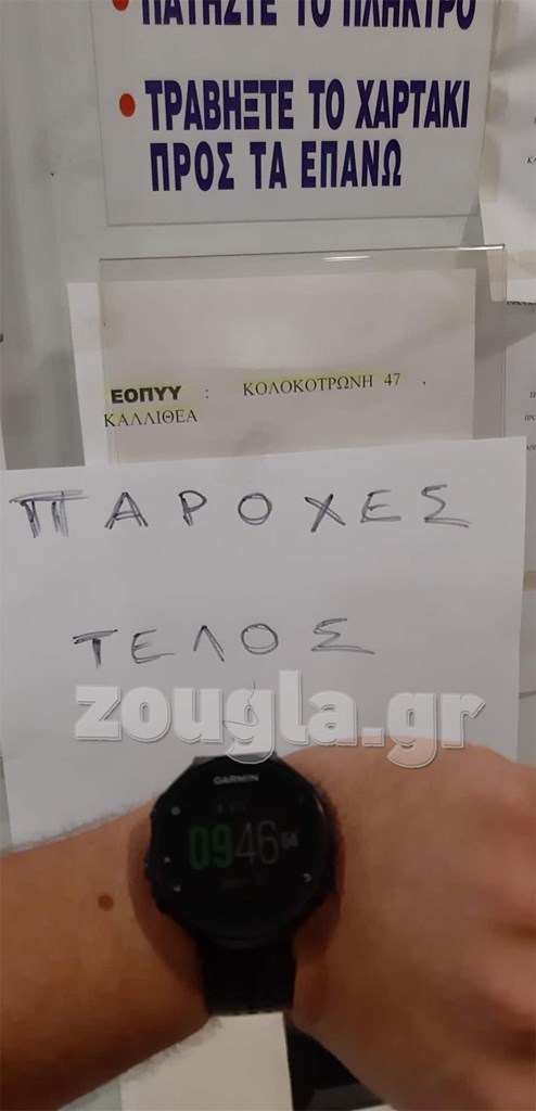 Ο πολίτης κοντοστέκεται στον κεντρικό διάδρομο και παρατηρεί τον χώρο. Ψάχνει με το βλέμμα του το σχετικό γκισέ και τον υπάλληλο που ασχολείται με τέτοιες υποθέσεις. Τον ενημερώνουν πως πρέπει να μεταβεί στον δεύτερο όροφο. Το κάνει. Μπαίνει στον χώρο των γραφείων και αμέσως καταλαβαίνει πως κάτι δεν πάει καλά, όταν διαπιστώνει πως σε όλο το τμήμα δεν βρίσκεται ούτε ένας υπάλληλος. Η δεύτερη έκπληξη, μεγαλύτερη από την πρώτη, έρχεται όταν φθάνει μπροστά από το γκισέ των παροχών και διαβάζει τις λέξεις στην αναρτημένη κόλλα Α4. «ΠΑΡΟΧΕΣ ΤΕΛΟΣ».