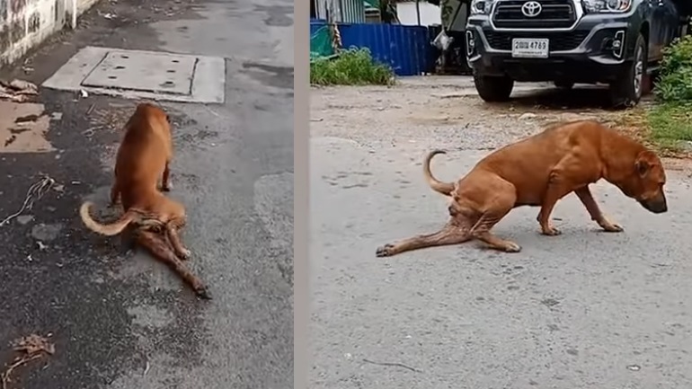 Ένας αδέσποτος σκύλος για να τραβήξει όλα τα βλέμματα πάνω του, προσποιείται πως έχει χτυπήσει το πόδι του.