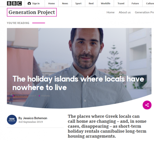 Για τις αρνητικές επιπτώσεις του Airbnb και τον μαζικό τουρισμό στα ελληνικά νησιά αναφέρεται σε νέο του άρθρο το BBC, με τίτλο «Τα νησιά – θέρετρα όπου οι ντόπιοι δεν έχουν που να ζήσουν».