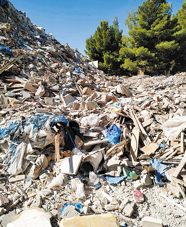 Σύμφωνα με τους επιθεωρητές, το κτίριο του εγκαταλειμμένου θεραπευτηρίου είχε κυριολεκτικά θαφτεί από τα μπάζα, οι σωροί των οποίων έφθαναν σε ύψος έως και έξι μέτρα. Οι επιθεωρητές υπολογίζουν ότι οι ποσότητες που πρέπει να απομακρυνθούν ξεπερνούν τα 9.000 κυβικά μέτρα – μάλιστα, πρέπει να τύχουν ειδικής διαχείρισης, καθώς περιλαμβάνουν όχι μόνο μπάζα, αλλά και άλλα σκουπίδια, που φαίνεται να έχουν προκύψει από κατασκευαστικές εργασίες ή κατεδαφίσεις (και έπρεπε κανονικά να οδηγηθούν σε κάποιο από τα αδειοδοτημένα για αυτόν τον σκοπό συστήματα). Μάλιστα, από την έρευνα προέκυψε ότι η ίδια εταιρεία είχε στο πρόσφατο παρελθόν εντοπιστεί να προβαίνει σε ανάλογες δραστηριότητες στη Θήβα.