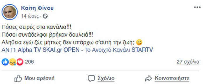 «Πόσες σειρές στα κανάλια!!! Πόσοι συνάδελφοι βρήκαν δουλειά!!! Αλήθεια εγώ ζω; μήπως δεν υπάρχω σ’αυτή την ζωή;».