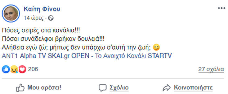 Το παράπονό της εξέφρασε η Καίτη Φίνου με ανάρτησή της στον προσωπικό της λογαριασμό στο Facebook.