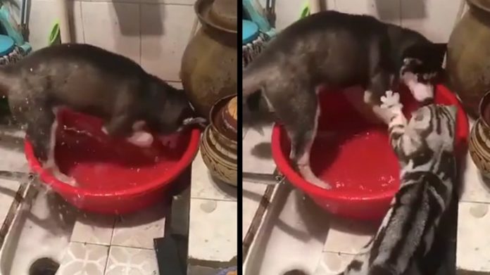 H γάτα φτάνει στα όριά της με τον σκύλο που σκάβει μέσα στον κουβά και γεμίζει το μπάνιο με νερά.