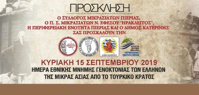 Εκδηλώσεις για την Ημέρα Εθνικής Μνήμης της Γενοκτονίας των Ελλήνων της Μικράς Ασίας θα πραγματοποιηθούν την Κυριακή 15 Σεπτεμβρίου 2019.