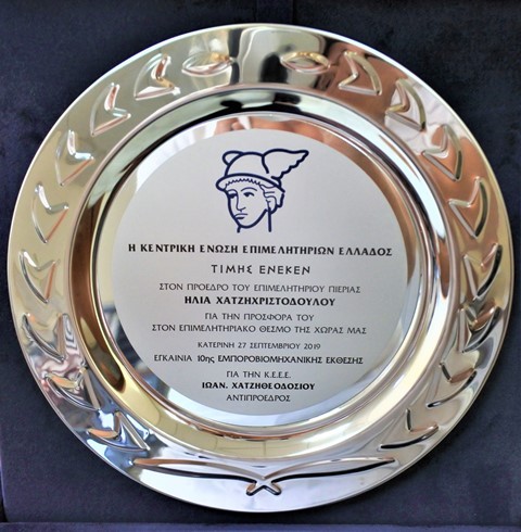 Η Κεντρική Ένωση Επιμελητηρίων Ελλάδας τίμησε τον Πρόεδρο του Επιμελητηρίου Πιερίας κ. Ηλία Χατζηχριστοδούλου για την προσφορά του στον Επιμελητηριακό Θεσμό της χώρας στο πλαίσιο της Επετειακής 10ης ΕΒΕΠ-ΚΜ 2019.