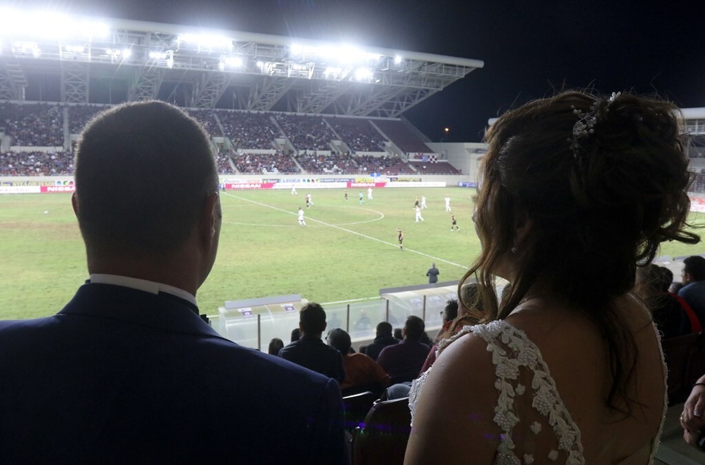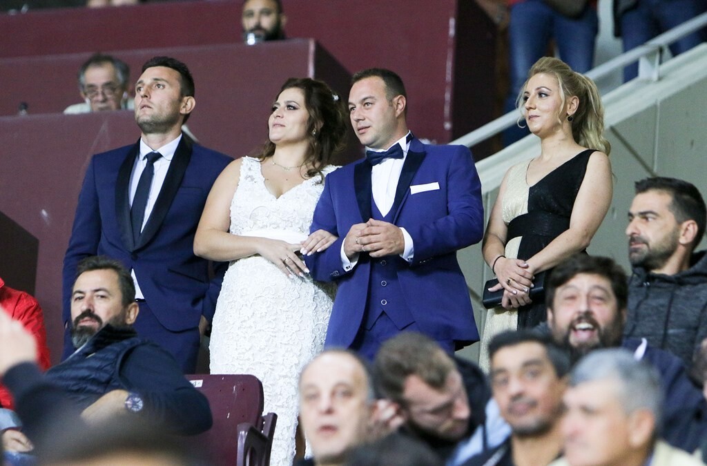 Η νύφη με το νυφικό και ο γαμπρός με το κουστούμι, κέρδισαν τα βλέμματα και τα χειροκροτήματα των παριστάμενων οπαδών.