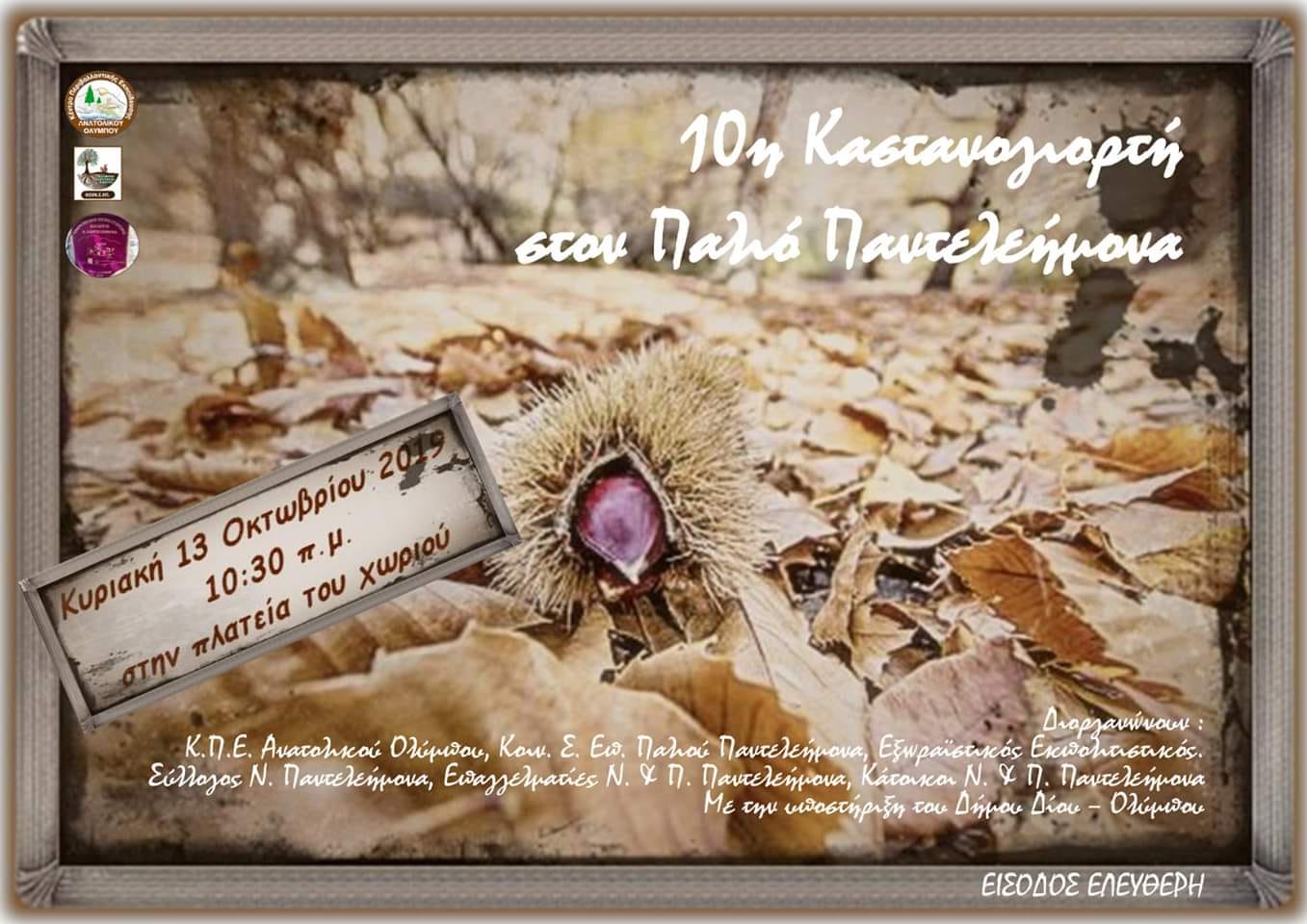 Σας προσκαλούμε στην «10η Καστανογιορτή» που θα πραγματοποιηθεί στην Πλατεία του Παλιού Παντελεήμονα Πιερίας την Κυριακή 13/10/2019 στις 10.30 π.μ..