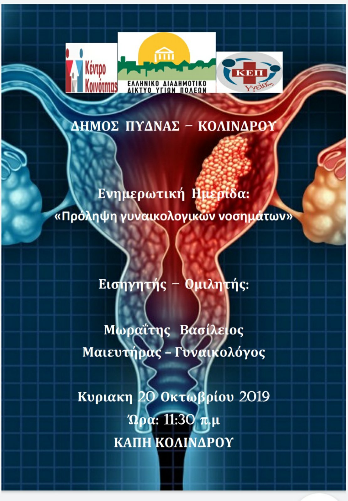Ο Δήμος Πύδνας-Κολινδρού σε συνεργασία με το ΚΕΠ ΥΓΕΙΑΣ ,το Κέντρο Κοινότητας και το Ελληνικό Διαδημοτικό Δίκτυο Υγιών Πόλεων (ΕΔΔΥΠΠΥ) στo πλαίσιο της πρόληψης, ευαισθητοποίησης και προαγωγής της υγείας, διοργανώνει ενημερωτική ημερίδα για την πρόληψη των γυναικολογικών νοσημάτων.