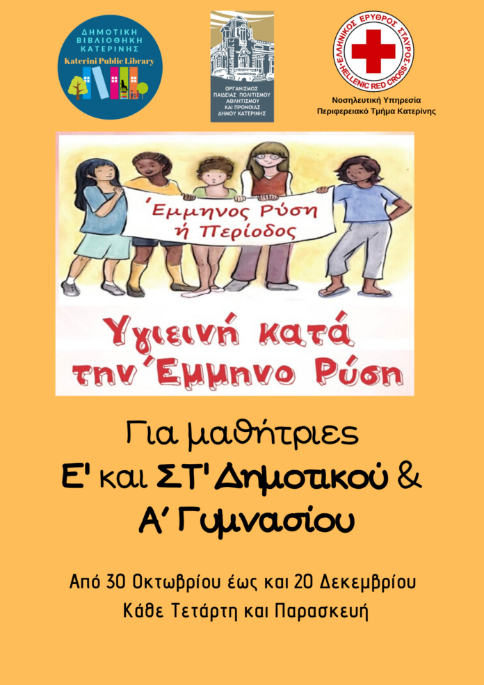 Εκπαιδευτικό πρόγραμμα προαγωγής της υγείας, με τίτλο «Υγιεινή κατά την Έμμηνο Ρύση» υλοποιεί η Δημοτική Βιβλιοθήκη Κατερίνης, σε συνεργασία με τη Νοσηλευτική Υπηρεσία του Ελληνικού Ερυθρού Σταυρού και τον Οργανισμό Παιδείας, Πολιτισμού, Αθλητισμού και Πρόνοιας του Δήμου Κατερίνης. Το πρόγραμμα απευθύνεται σε μαθήτριες Ε΄ και ΣΤ΄ τάξης του Δημοτικού Σχολείου, καθώς και σε μαθήτριες Α’ τάξης Γυμνασίου, ενώ αφορά κυρίως στην ενημέρωση για την ατομική υγιεινή κατά τη διάρκεια της εμμήνου ρύσεως.