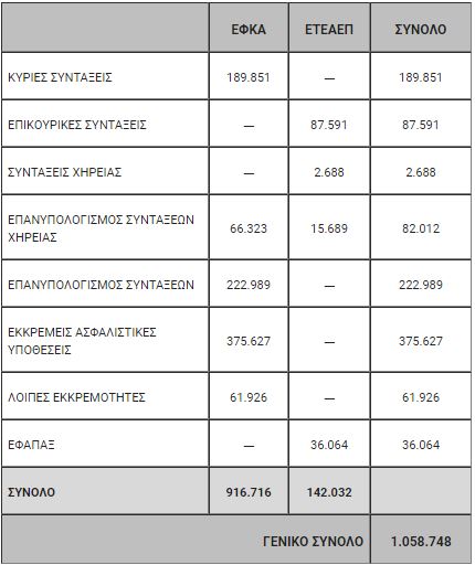Η πραγματική εικόνα των εκκρεμών συντάξεων-υποθέσεων και λοιπών εκκρεμοτήτων μέχρι τις 31-8-2019, σύμφωνα με τα επίσημα στοιχεία των υπηρεσιών του ΕΦΚΑ και του ΕΤΕΑΕΠ έχει ως εξής: