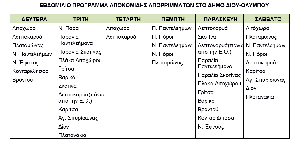 ΕΒΔΟΜΑΔΙΑΙΟ ΠΡΟΓΡΑΜΜΑ ΑΠΟΚΟΜΙΔΗΣ ΑΠΟΡΡΙΜΜΑΤΩΝ ΣΤΟ ΔΗΜΟ ΔΙΟΥ-ΟΛΥΜΠΟΥ