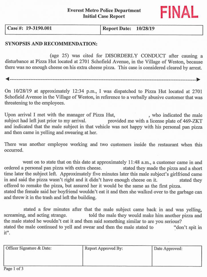 Το περιστατικό έγινε ανήμερα της 28ης Οκτωβρίου στην Pizza Hut του Γουέστον, όπου ένας 25χρονος πήρε παρήγγειλε μία pan pizza με έξτρα τυρί.