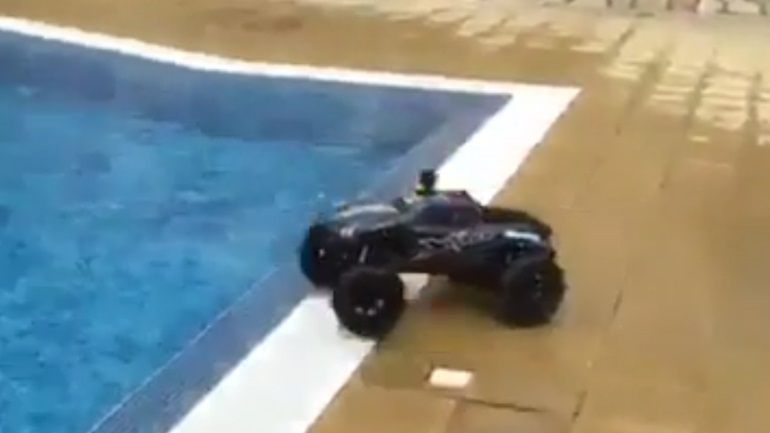 Ένα τηλεκατευθυνόμενο αυτοκίνητο τρέχει με ταχύτητα πάνω στο νερό μιας πισίνας. Ο Ιησούς Χριστός!