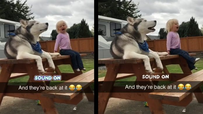 Στο Marysville της Ουάσινγκτον, ο Dude το χάσκι και η 2 ετών Everlee, έχουν μια στιγμή συνεργασίας. Το μικρό κορίτσι διασκεδάζει ουρλιάζοντας και ο σκύλος την μιμείται.