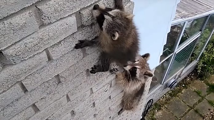 Ένα μικρό ρακούν είναι πολύ φοβισμένο για να κατεβεί κάτω από έναν τοίχο που σκαρφάλωσε, οπότε η μαμά πρέπει να ανέβει και να το βοηθήσει να κατέβει.