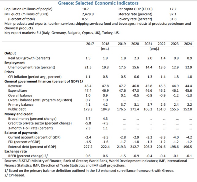 Το Διεθνές Νομισματικό Ταμείο στην εν λόγω έκθεση εκτιμά ότι υπερκαλύπτεται ο δημοσιονομικός στόχος για φέτος (3,7% του ΑΕΠ πρωτογενές πλεόνασμα, βελτιώνοντας την πρόβλεψη κατά 0,2% έναντι των προηγούμενων εκτιμήσεών του) αλλά κάνει σαφές ότι αυτό δεν θα καταστεί εφικτό το 2020 (3,1% πρωτογενές πλεόνασμα) ούτε στη συνέχεια (2,7% με 2,2% πρωτογενές πλεόνασμα από το 20221 έως το 2024), λόγω των ασκούμενων πολιτικών. Πρόκειται για μία θέση με την οποία δεν διαφωνεί μόνο η Αθήνα αλλά και η Επιτροπή που έχει ήδη έχει ήδη επιβεβαιώσει την επίτευξη του στόχου το 2020 και το 2021.