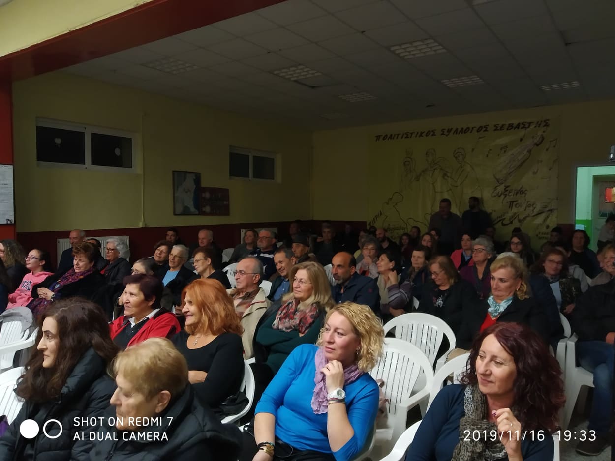 Την εκδήλωση προλόγισε ο πρόεδρος της Τ.Κ. και παράλληλα του Πολιτιστικού Συλλόγου Σεβαστής Κυριάκος Κωνσταντινίδης, ο όποιος μίλησε με θερμά λόγια για τους συντελεστές του θεατρικού έργου και ευχαρίστησε τον Πολιτιστικό Οργανισμό του Δήμου Κατερίνης, για την ένταξη της όμορφης αυτής παράστασης στο πρόγραμμα των φετινών Αικατερινείων.