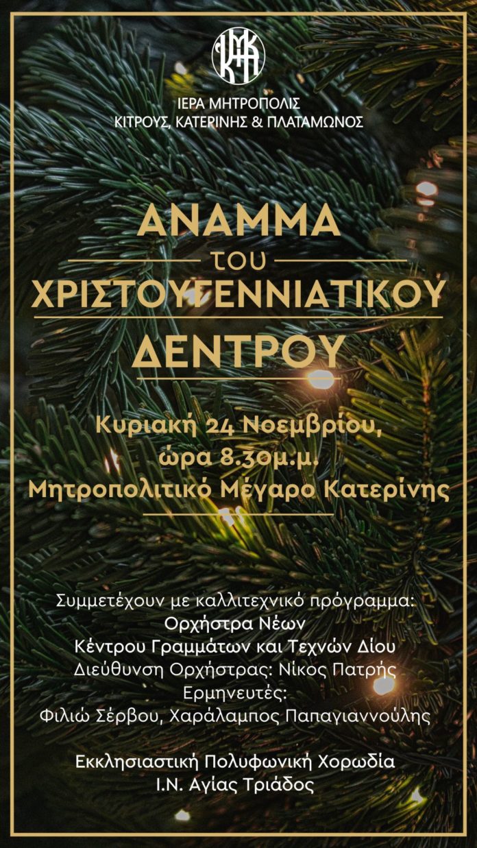 Την Κυριακή 24 Νοεμβρίου, στις 8.30 το βράδυ, μπροστά στο Μητροπολιτικό Μέγαρο, θα πραγματοποιηθεί υπαίθρια χριστουγεννιάτικη εκδήλωση των Κατηχητικών Συνάξεων της Κατερίνης.