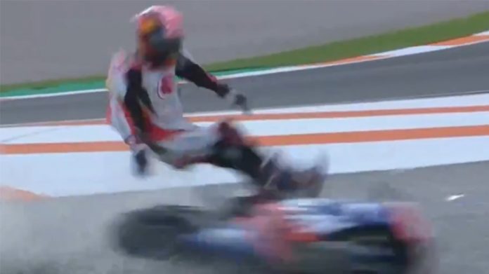 Κατά τη διάρκεια του Moto GP που ολοκληρώθηκε αυτό το Σαββατοκύριακο στη Βαλένθια της Ισπανίας, μοτοσυκλέτα χωρίς αναβάτη χτυπά τον οδηγό Johann Zarco.