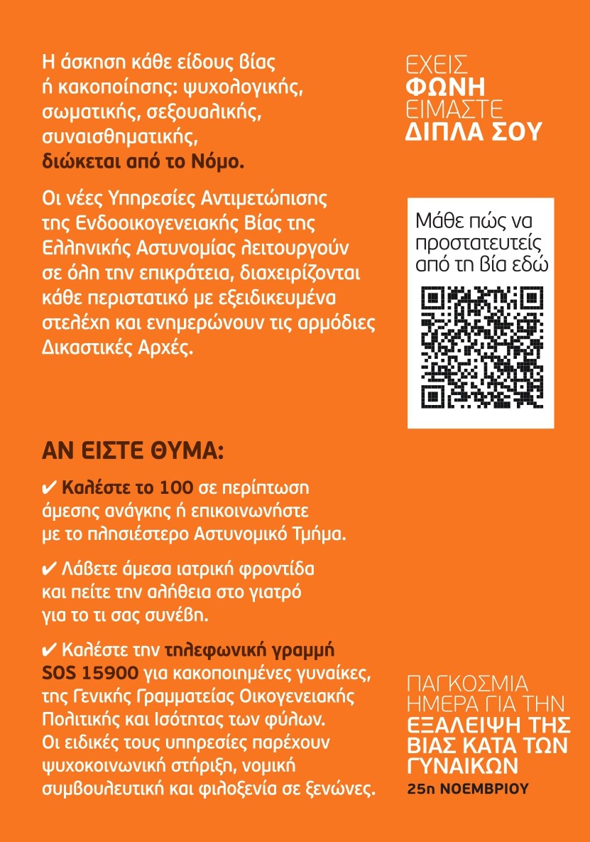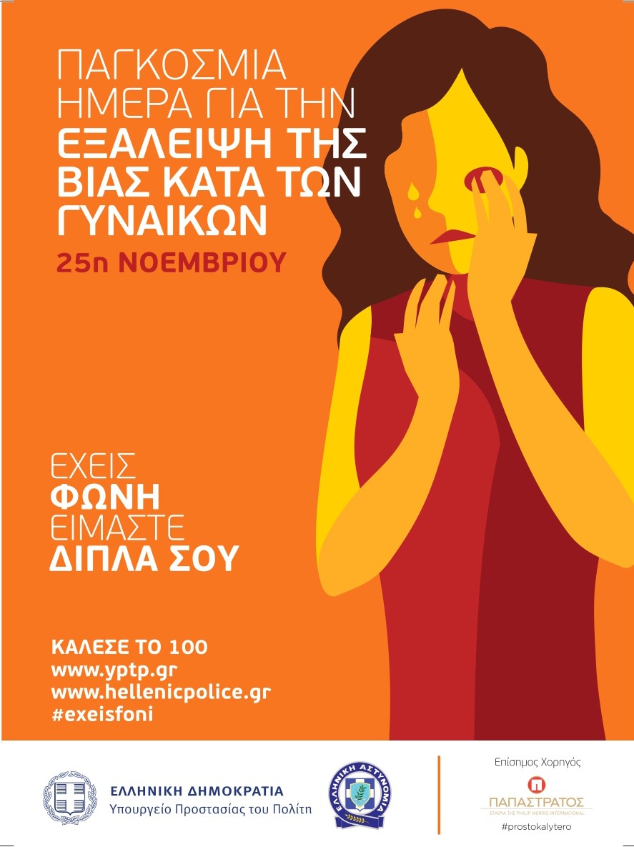 Με πρωτοβουλία του Υπουργείου Προστασίας του Πολίτη και του Αρχηγείου της Ελληνικής Αστυνομίας και με αφορμή την Παγκόσμια Ημέρα Εξάλειψης της Βίας κατά των Γυναικών (25η Νοεμβρίου), διοργανώνεται κοινή δράση, σε συνεργασία με τη Γενική Γραμματεία Οικογενειακής Πολιτικής & Ισότητας των Φύλων και το Κέντρο Ερευνών για Θέματα Ισότητας των Φύλων (ΚΕΘΙ).