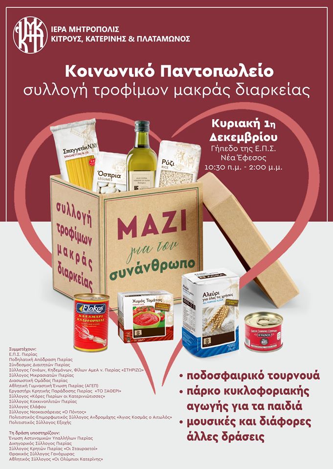 Ο Σύλλογος Μικρασιατών Πιερίας συμμετέχει στην κοινή δράση των Συλλόγων και Φορέων της Πιερίας…με την στήριξη και ευλογία από τον Σεβασμιώτατο Μητροπολίτη Κίτρους, Κατερίνης και Πλαταμώνος κ. Γεώργιο, για την συλλογή τροφίμων μακράς διάρκειας…τα οποία θα διανεμηθούν μέσω του Κοινωνικού Παντοπωλείου της Ιεράς Μητροπόλεως Κίτρους και των Ενοριακών Παραρτημάτων του στις εκατοντάδες άπορες οικογένειες της Πιερίας…