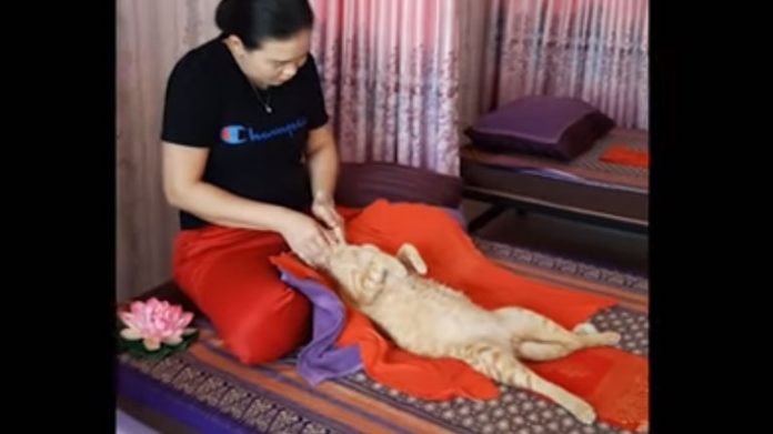 Ένα αιλουροειδές στην Ταϊλάνδη αποτελεί τρανό παράδειγμα αυτού, καθώς έχει παραδοθεί στο θεραπευτικό μασάζ που του κάνει μια κυρία.