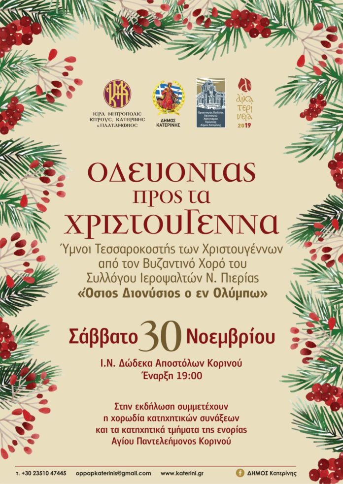 Με τίτλο «Οδεύοντας προς τα Χριστούγεννα» ο Βυζαντινός χορός του Συλλόγου Ιεροψαλτών Ν. Πιερίας «Ο Όσιος Διονύσιος ο εν Ολύμπω» θα ψάλει ύμνους της Τεσσαρακοστής των Χριστουγέννων. Τον Χορό θα διευθύνει ο Δημήτριος Καραμούζας.