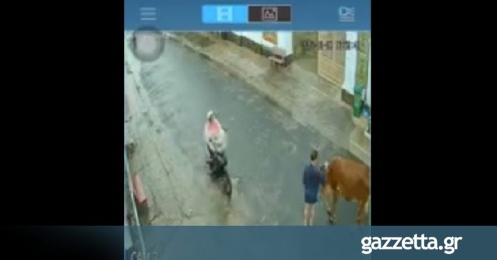 Γυναίκα χαϊδεύει αγελάδα, εκείνη την κλωτσάει και διερχόμενο μηχανάκι πέφτει πάνω της (vid)