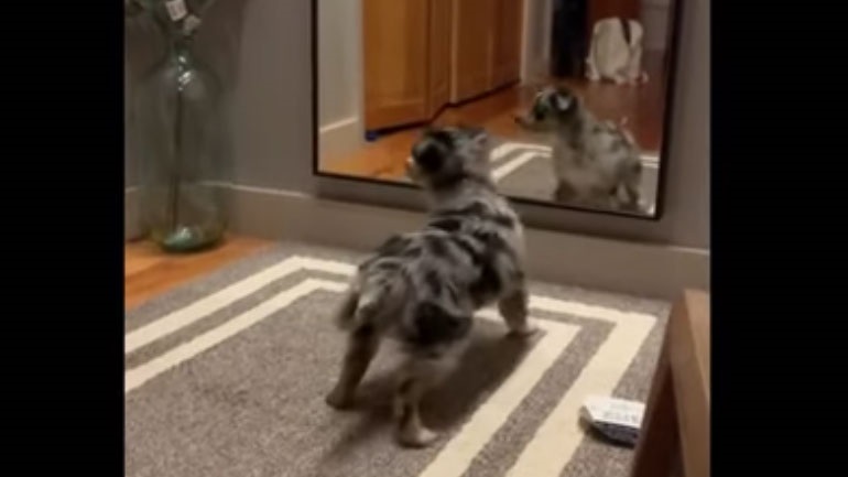 Κουταβάκι μπερδεύεται από την αντανάκλασή του στον καθρέφτη