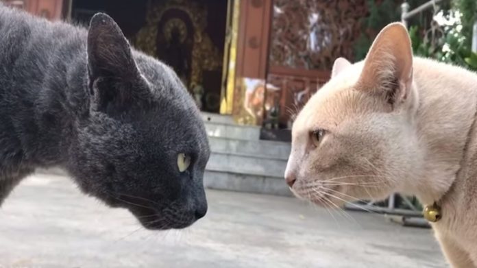 Δύο γάτες έξω από βουδιστικό ναό στην Τσιάνγκ Μάι της Ταϊλάνδης αποφάσισαν να στήσουν τον… απόλυτο καβγά, διασκεδάζοντας τους περαστικούς για πέντε ολόκληρα λεπτά.
