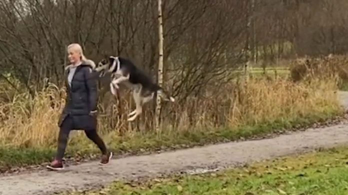 Όλοι οι σκύλοι χαίρονται όταν ακούνε τη λέξη «βόλτα», αλλά το κατοικίδιο αυτής της κοπέλας δεν μπορεί να σταματήσει να χοροπηδάει καθώς περπατάνε μαζί στον δρόμο.