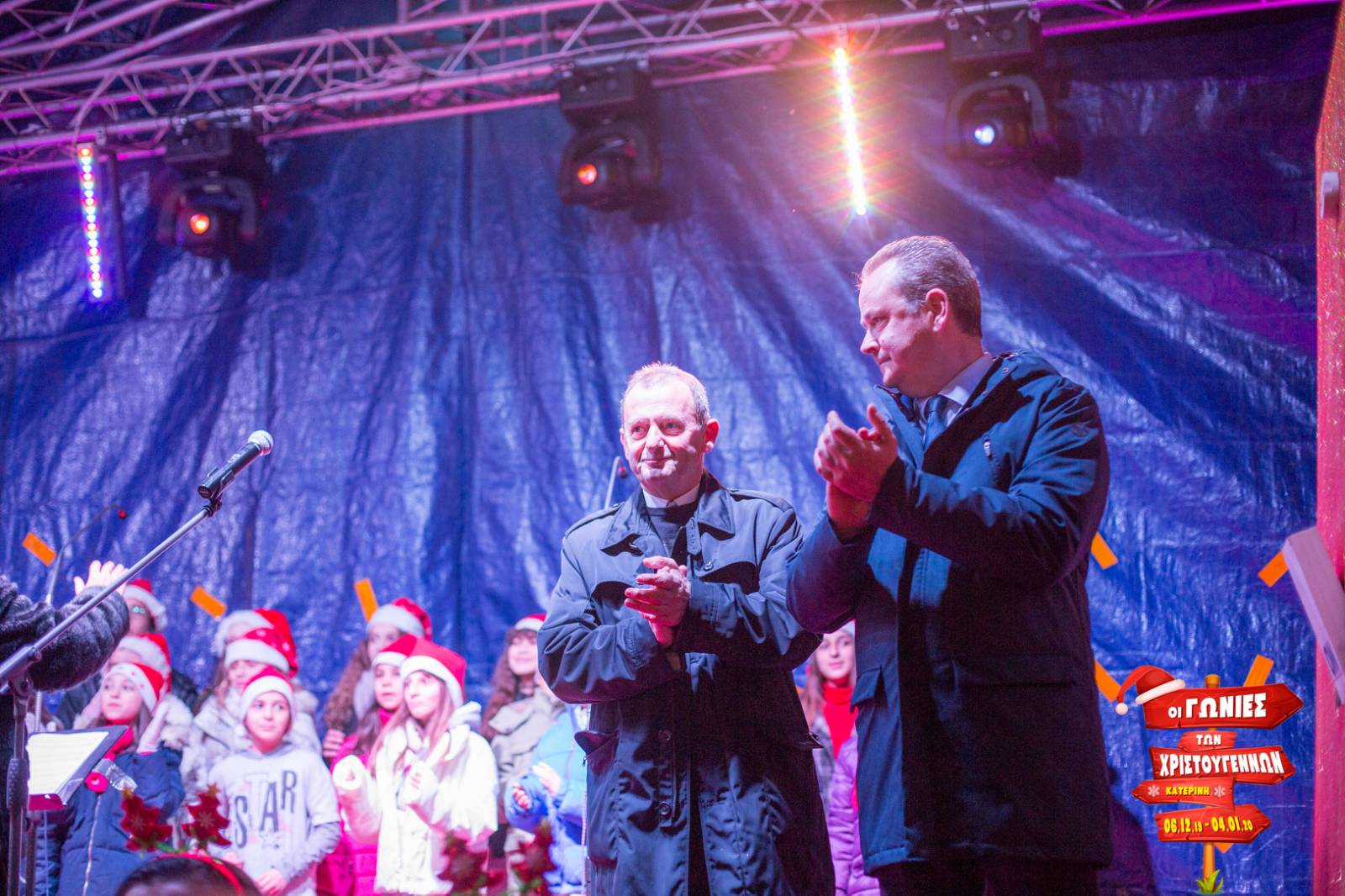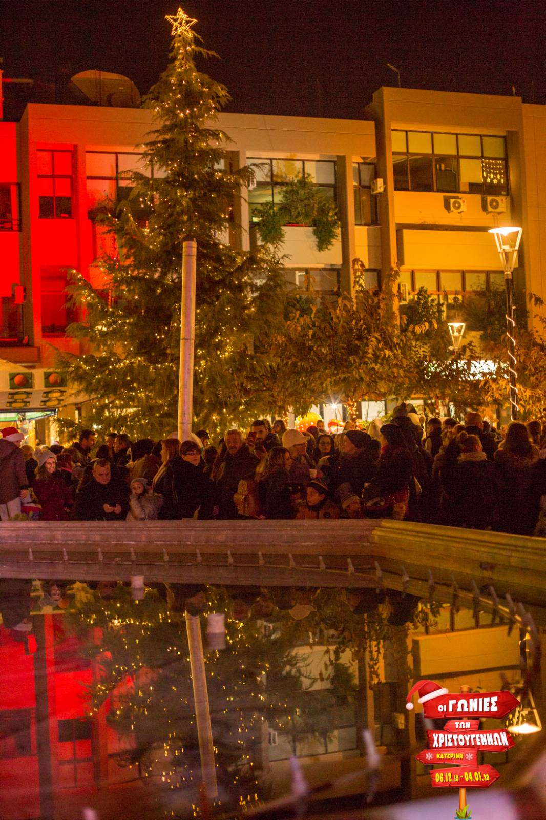 Το σύνθημα για το άναμμα του πανύψηλου δέντρου της πόλης και του πολύχρωμου, φωτεινού διακόσμου έδωσε από την πλατεία Δημαρχείου, ο Δήμαρχος Κατερίνης Κώστας Κουκοδήμος, με την συνδρομή του Προέδρου του Επιμελητηρίου Πιερίας Ηλία Χατζηχριστοδούλου, καθώς και των παιδιών της χορωδίας του Δημοτικού Ωδείου Κατερίνης.