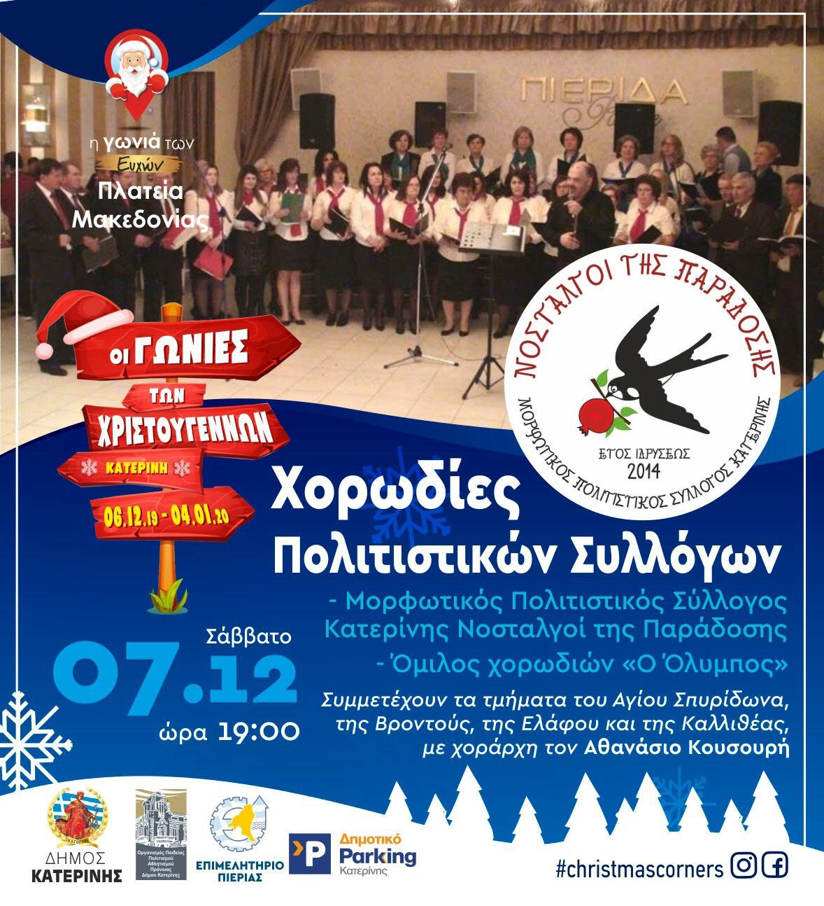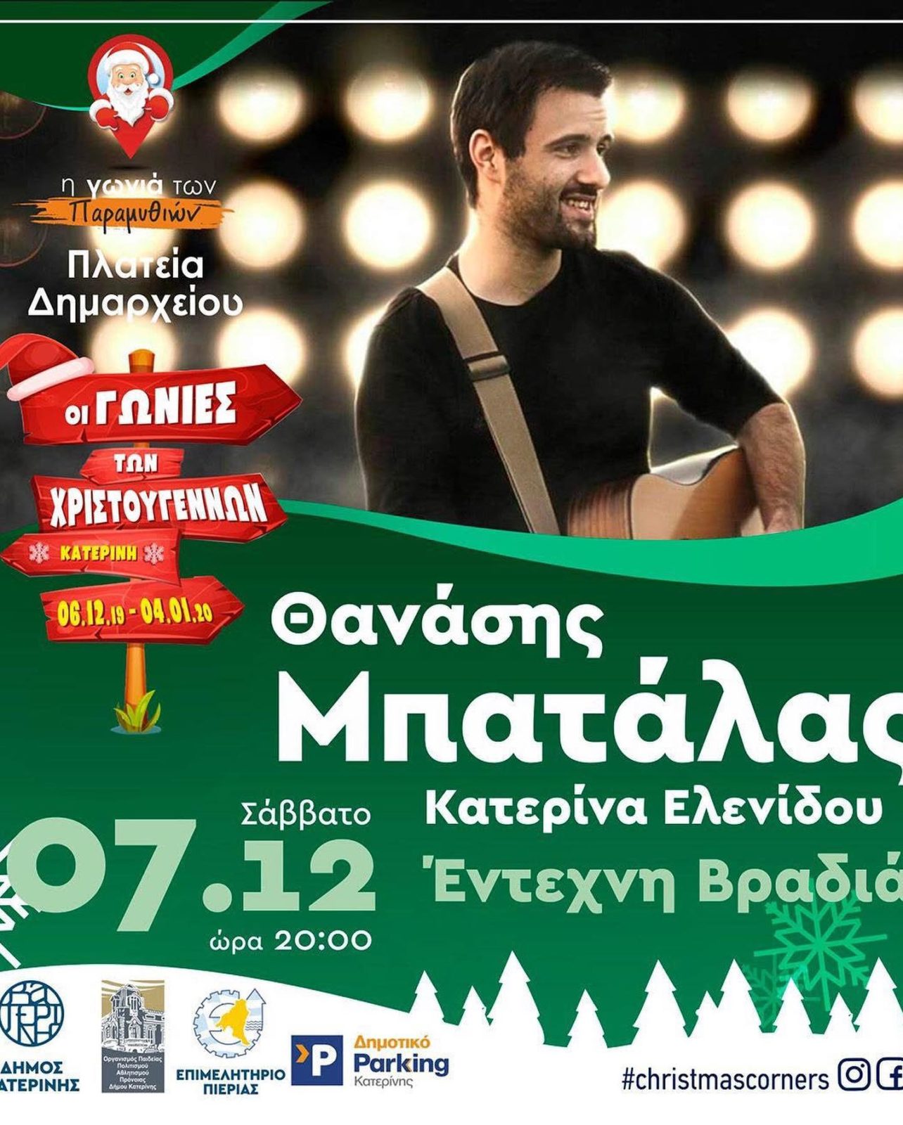 «Οι γωνιές των Χριστουγέννων» του Δήμου Κατερίνης, η γιορτή που διαχέεται σε όλη την πόλη, σε κάθε γειτονιά, σε κάθε ΓΩΝΙΑ συνεχίζεται με το πρόγραμμα του ΣΑΒΒΑΤΟΥ 07 ΔΕΚΕΜΒΡΙΟΥ ως εξής: