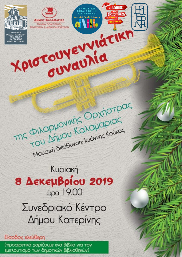 Χριστουγεννιάτικη συναυλία της Φιλαρμονικής Ορχήστρας του Δήμου Καλαμαριάς – Κυριακή 8 Δεκεμβρίου 2019 και ώρα 19.00, στο Συνεδριακό Κέντρο του Δήμου Κατερίνης.