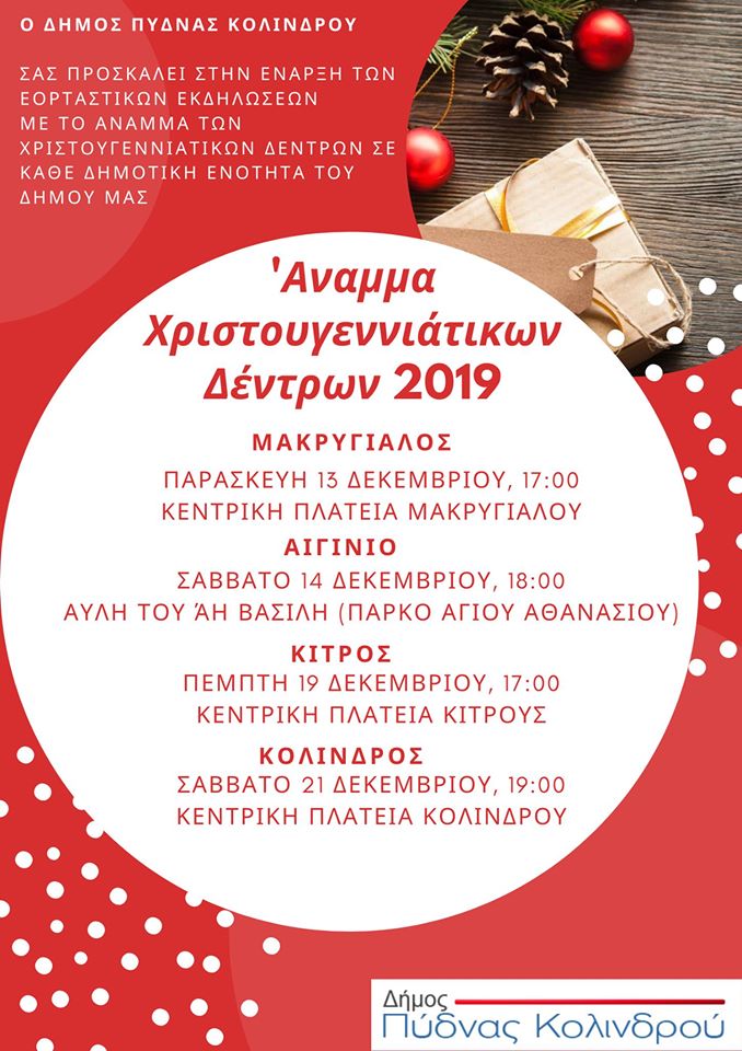 Ο Δήμος Πύδνας – Κολινδρού σας προσκαλεί στην έναρξη των εορταστικών εκδηλώσεων με το άναμμα των Χριστουγεννιάτικων δέντρων σε κάθε Δημοτική Ενότητα του Δήμου μας