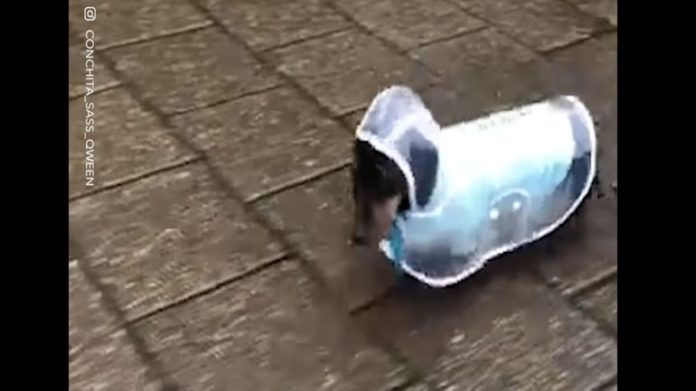 Το πανέμορφο κουταβάκι φοράει το μικροσκοπικό του αδιάβροχο παλτό και «οργώνει» τους δρόμους χωρίς κανένα πρόβλημα.