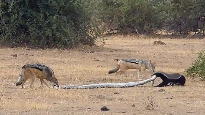 Μάχη ανάμεσα σε έναν πύθωνα, δύο τσακάλια και έναν μελοασβό