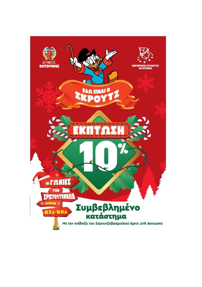 Ο Σκρουτζ επηρεάστηκε από τις γωνιές των Χριστουγέννων και αποφάσισε αυτά τα Χριστούγεννα να γίνει ανοιχτοχέρης! Εκμεταλλεύσου την ευκαιρία και αγόρασε ένα βραχιολάκι από την γωνιά του Σκρουτζ – Πεζόδρομος Κατερίνης και αγόρασε με 10% έκπτωση από όλα τα συμβεβλημένα καταστήματα!