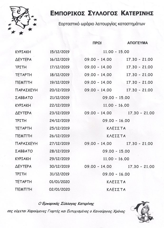 Η έναρξη του φετινού Χριστουγεννιάτικου ωραρίου λειτουργίας των καταστημάτων της Κατερίνης θα τεθεί σε ισχύ από Κυριακή 15 Δεκεμβρίου 2019 έως και 2 Ιανουαρίου 2020