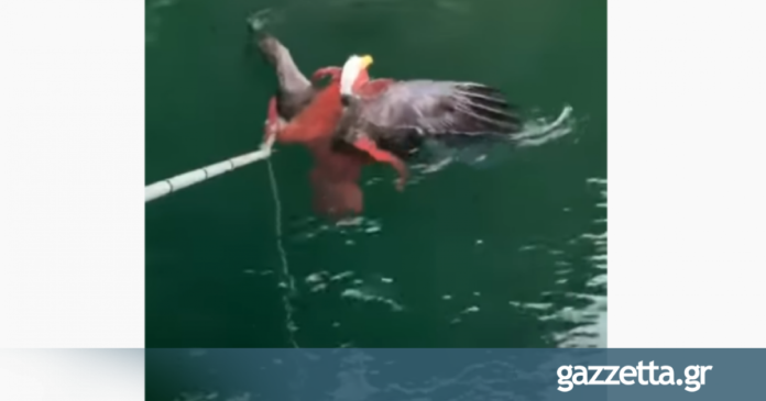 Οι άνδρες αποφάσισαν να σώσουν το πουλί με ένα κοντάρι και αφού τα κατάφεραν το οδήγησαν στην ακτή.