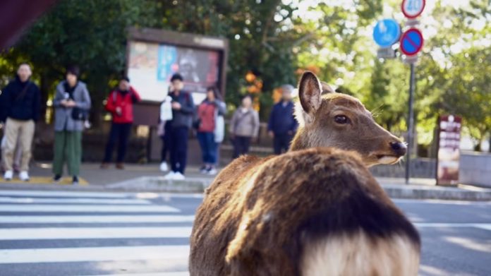 Ένα πανέξυπνο ελαφάκι από τη Νάρα της Ιαπωνίας περιμένει να ανάψει το φανάρι για τους πεζούς, ώστε να περάσει με ασφάλεια τον δρόμο.